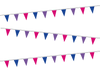 Triangular pennants measure 20 cms x 30 cms and are sewn onto strong white polypropylene tape, consisting of 24 pennants per 10m length. Longer 25m lengths are also available with 60 pennants per length.